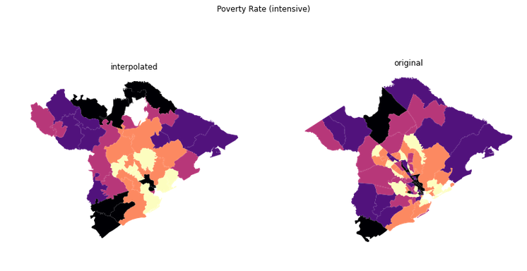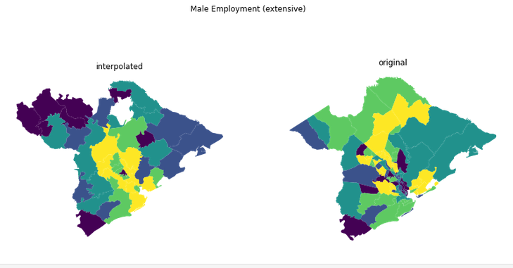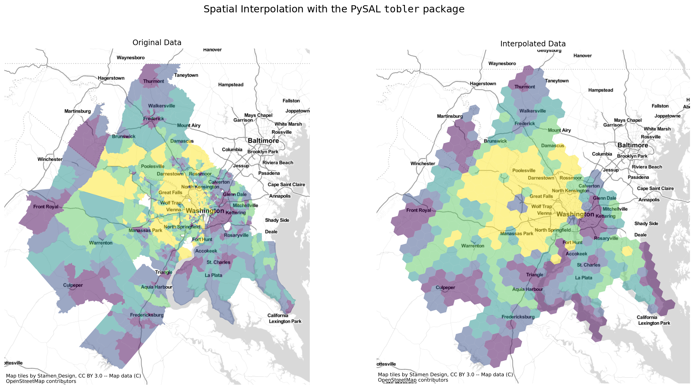 tobler is a library for areal interpolation and dasymetric mapping. The name is an homage to the legendary geographer Waldo Tobler. It is a subpackage of PySAL (Python Spatial Analysis Library), and is under active development.